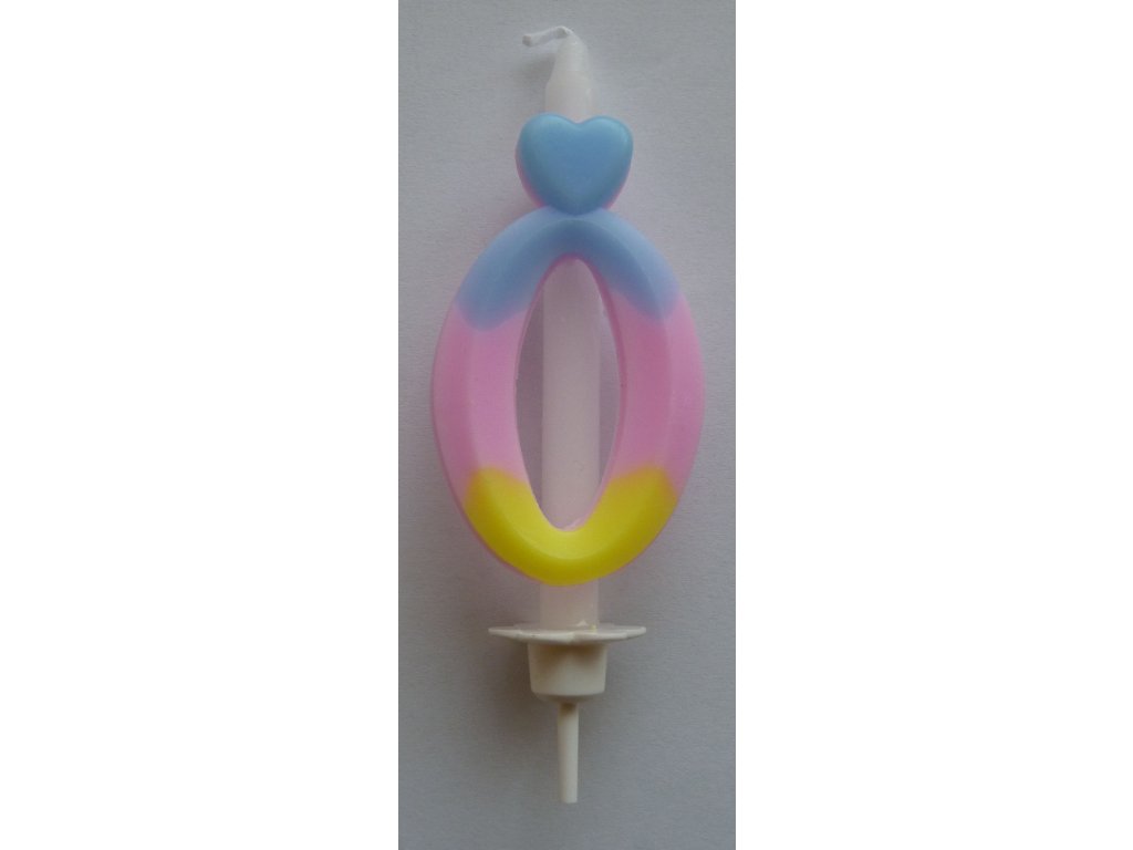 Tęczowa świeczka na plastikowej podstawie - cyfra 0.